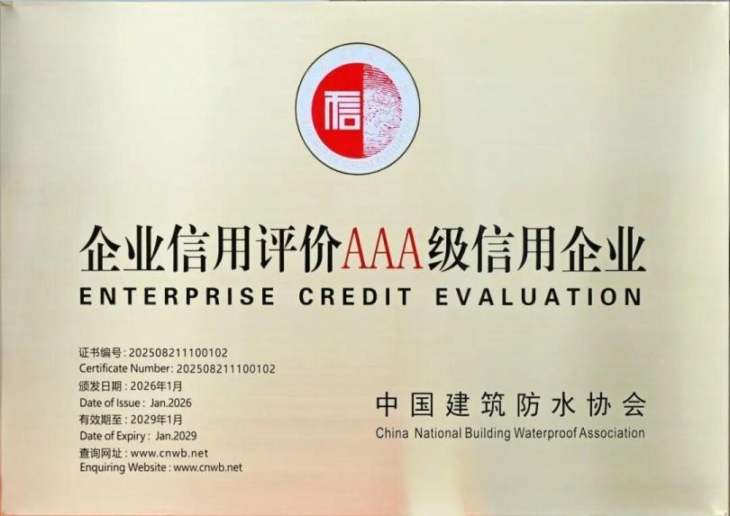 The credit rating system developed by the China Building Waterproofing Association is scientific and rigorous, comprehensively evaluating enterprises from multiple dimensions, including basic credit, operational capabilities, financial strength, management capabilities, social credit, and development trends. AAA rating, the highest level in this system, represents an excellent credit record, strong contract performance capabilities, and broad development prospects. Canlon's recent rating directly reflects its comprehensive strength in corporate governance, product quality, contract performance, customer service, and social responsibility, reaching a first-class level in the industry, providing a solid guarantee of confidence for partners and customers.