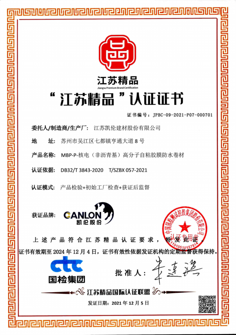 Canlon is a pioneering building materials manufacturer in China that applies waterproofing products to nuclear power projects. It has contributed to numerous high-quality projects, including the Rongcheng Nuclear Power Plant in Shandong, the Sanmen and Qimen Nuclear Power Plants in Zhejiang, and the Xiapu, Fuqing, and Zhangzhou Nuclear Power Plants in Fujian. The Fuqing Nuclear Power Plant unit project, in particular, won the National Excellent Project Award (Gold Award). The company's flagship product, MBP-P polymer self-adhesive waterproof membrane, has passed the supplier certification of China National Nuclear Corporation (CNNC) and has also obtained "Jiangsu Excellent Product" and "Suzhou Manufacturing" certifications. The selection of Canlon's TPR waterproof membrane and rubber-plastic blend self-adhesive waterproof membrane system for Unit 1 of the Jiangsu Xuwei Nuclear Power Plant further demonstrates Canlon's leading position in the nuclear power waterproofing field.