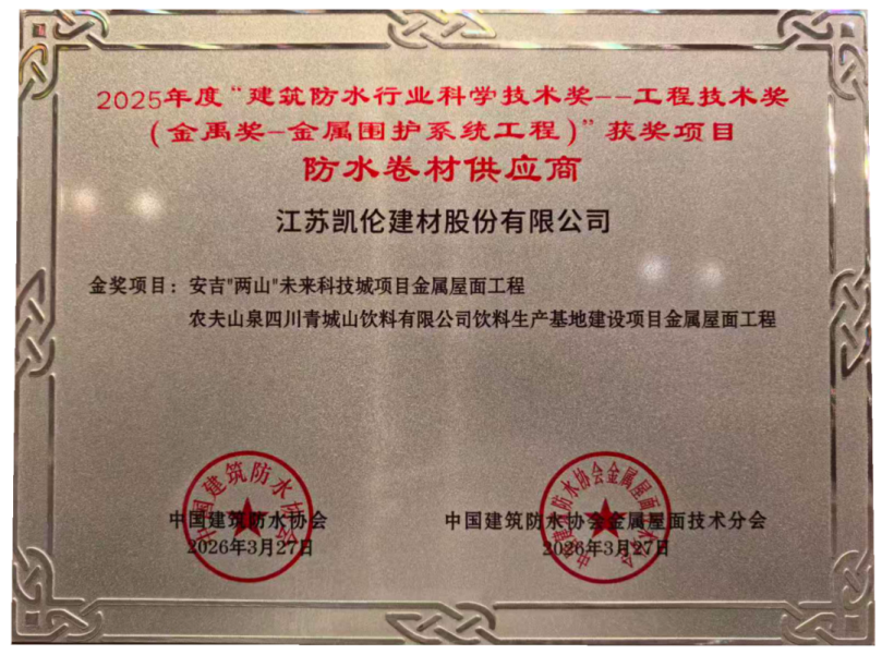 Meanwhile, the list of material suppliers for the 2025 "Building Waterproofing Industry Science and Technology Award - Engineering Technology Award (Jinyu Award - Metal Enclosure System Engineering)" was officially announced. Jiangsu Canlon Building Materials Co., Ltd. was awarded the title of "Waterproofing Membrane Supplier" for its key supporting and engineering performance in two gold award projects .