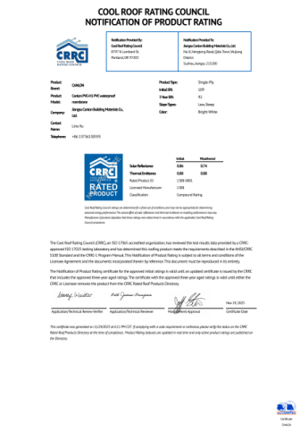 Recently, Canlon has added another internationally authoritative certification – its TPO/PVC waterproof membrane has successfully passed the product rating accreditation of the Cool Roof Rating Council (CRRC) after three years of outdoor testing, making it one of the few domestic companies to hold certifications for both polymer waterproof materials. This also signifies that Canlon's roofing waterproofing products have reached internationally advanced levels in terms of thermal radiation efficiency and green energy-saving performance, opening new channels for expanding into the global green building market.