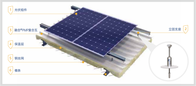 PMP® Integrated roofing panels consist of an exposed polyvinyl chloride (PVC) waterproof membrane as the outer layer, which is bonded to a metal sheet through a special processing technique and then rolled and bent using a tile press to form a shaped roofing panel. It combines the simple and quick installation of traditional steel roofs with the weather resistance and corrosion resistance of PVC waterproofing layers, offering a minimum 25-year warranty and effectively reducing roofing layers and material costs.