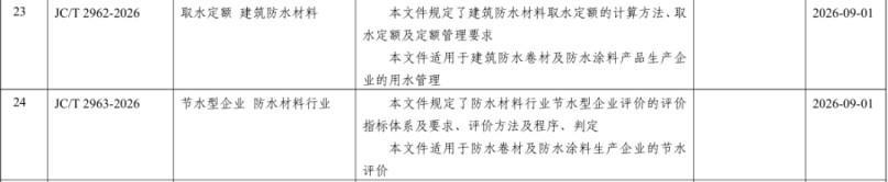 JC/T 2963-2026 "Water-Saving Enterprises in the Waterproofing Materials Industry" establishes an evaluation index system for water-saving enterprises in the waterproofing materials industry, clarifies evaluation requirements, methods, procedures, and judgment rules, and covers waterproof membrane and waterproof coating manufacturers. It provides a unified basis for the industry to carry out the creation, evaluation, and hierarchical management of water-saving enterprises, and helps enterprises accelerate water-saving technology transformation and management upgrades.