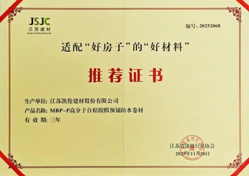 On November 20th, after rigorous review by the Jiangsu Provincial Building Materials Industry Association, Canlon's MBP-P polymer self-adhesive waterproof membrane was selected into the list of recommended "good materials" suitable for "good houses" due to its excellent product performance and environmental protection quality.