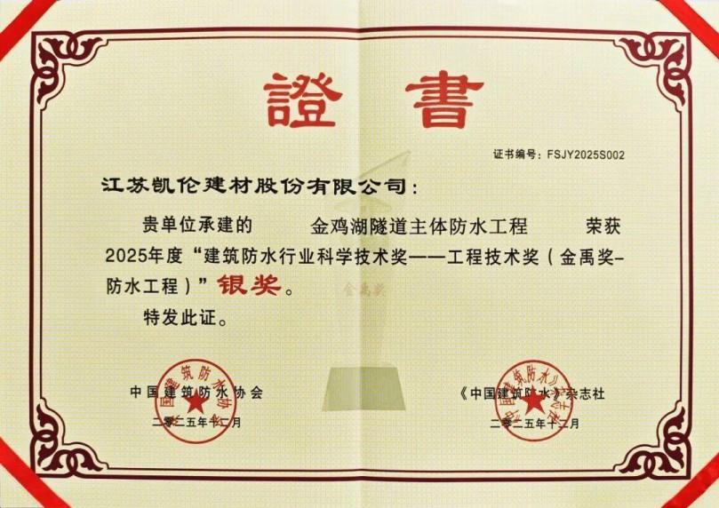 Canlon's "A Two-Component Room Temperature Non-Curing Asphalt Polyurethane Waterproof Coating and Its Preparation Method" (ZL 201910712580.X) won the "Golden Key" Patent Technology Award; the Jinji Lake Tunnel main waterproofing project won a silver award in the Engineering Technology Award (Jinyu Award), powerfully demonstrating the excellent quality of the integrated waterproofing system.