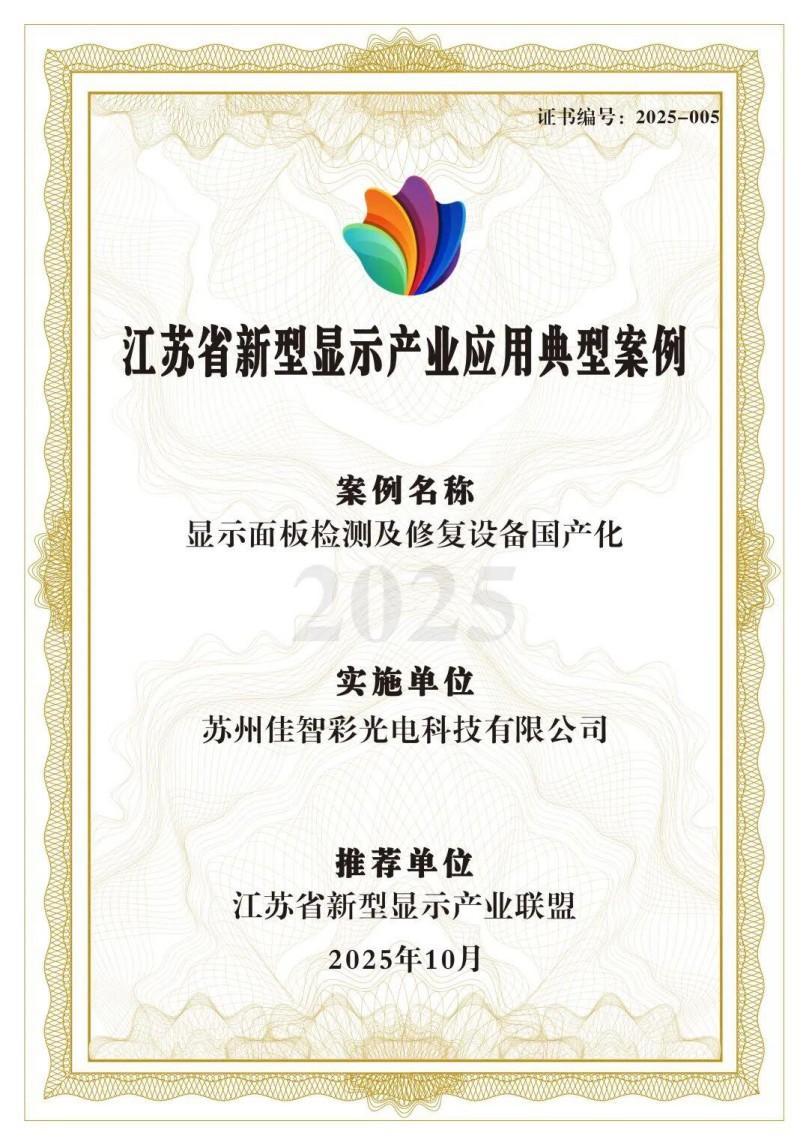 In October, the Jiangsu Provincial New Display Industry Alliance selected and commended typical cases of new display applications in Jiangsu Province for 2025. Suzhou Jiazhicai Optoelectronics Technology Co., Ltd. stood out with its "Domestication of Display Panel Testing and Repair Equipment" project and was recognized as a typical case in the industrial production field.