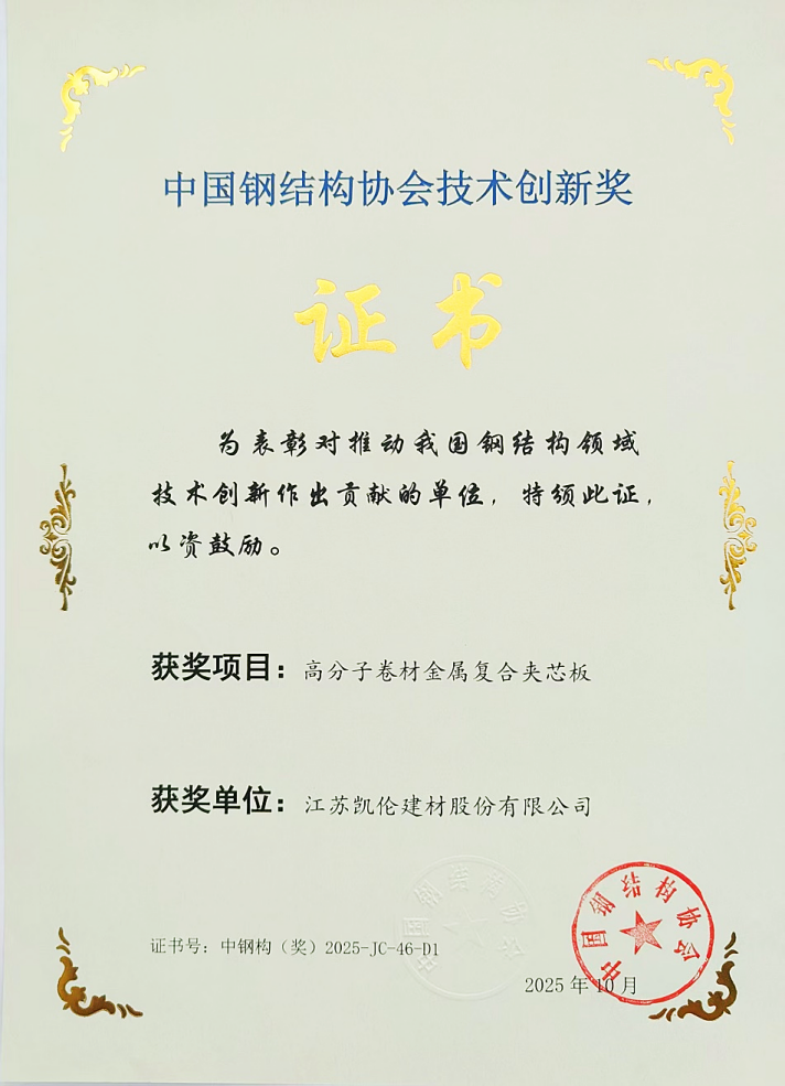 On October 13, 2025, the "9th Member Representative Conference of China Steel Structure Association and 2025 China Steel Structure Conference" was grandly opened in Nanning, Guangxi. Canlon's "Polymer Membrane Metal Composite Sandwich Panel" project won the 2025 "Technological Innovation Award" from the China Steel Structure Association for its industry-leading innovation and practicality.